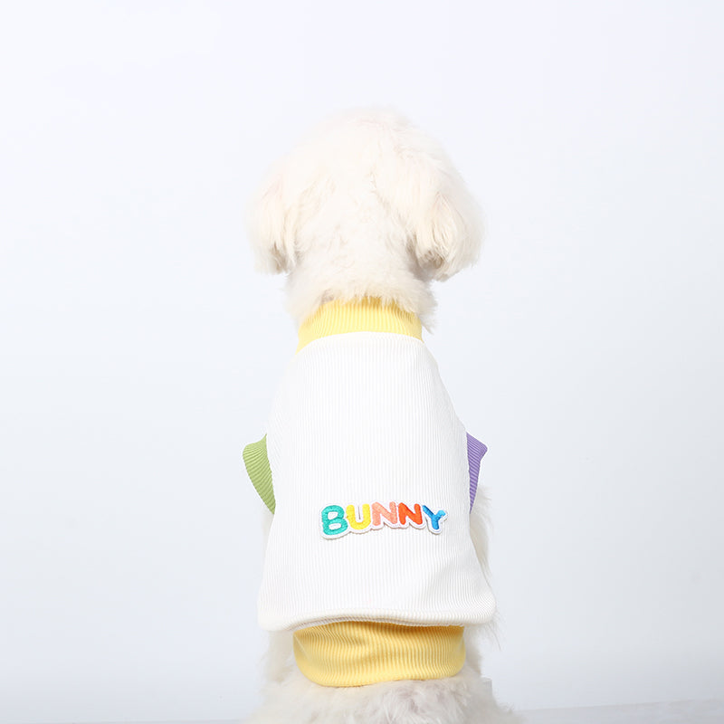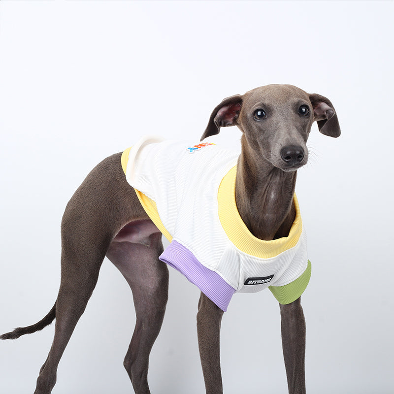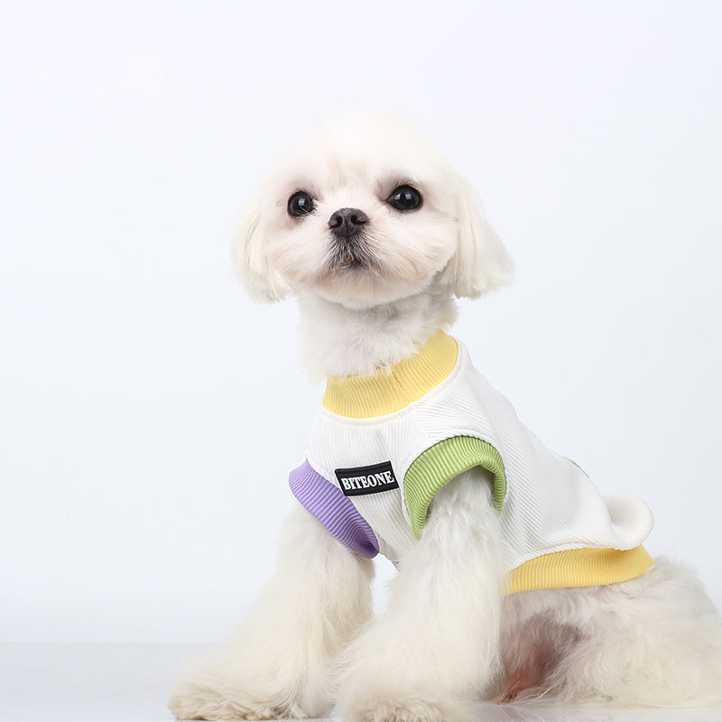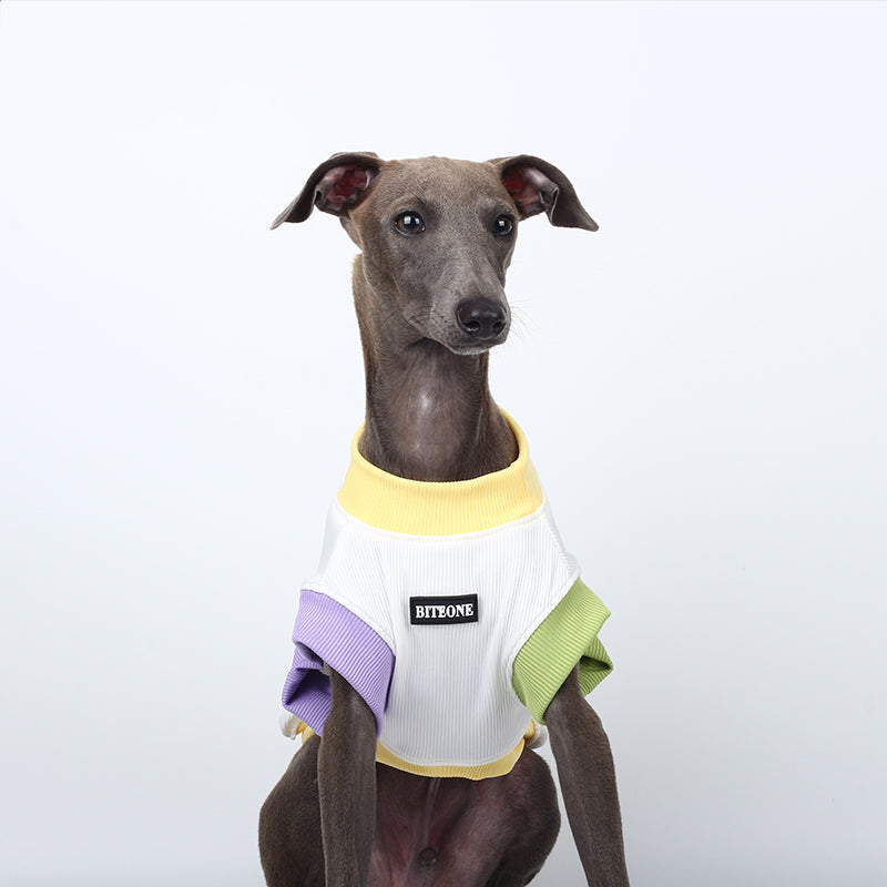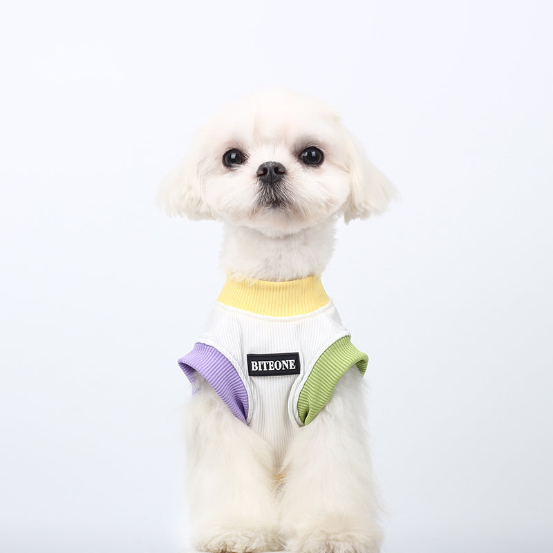 Vibrant Multi-Color Scheme - A playful outfit featuring a yellow collar and pastel purple and green sleeve accents. This design exudes a lively summer vibe, showcasing a youthful and energetic style.