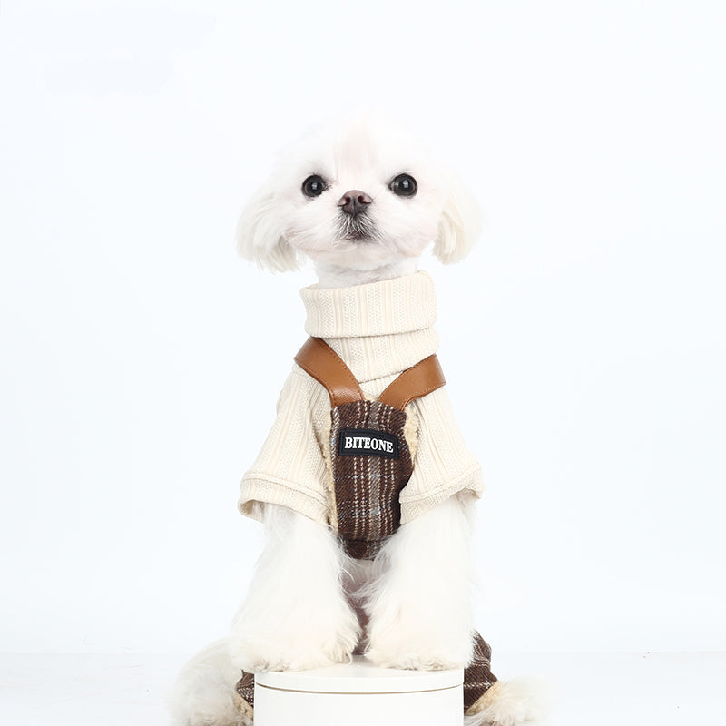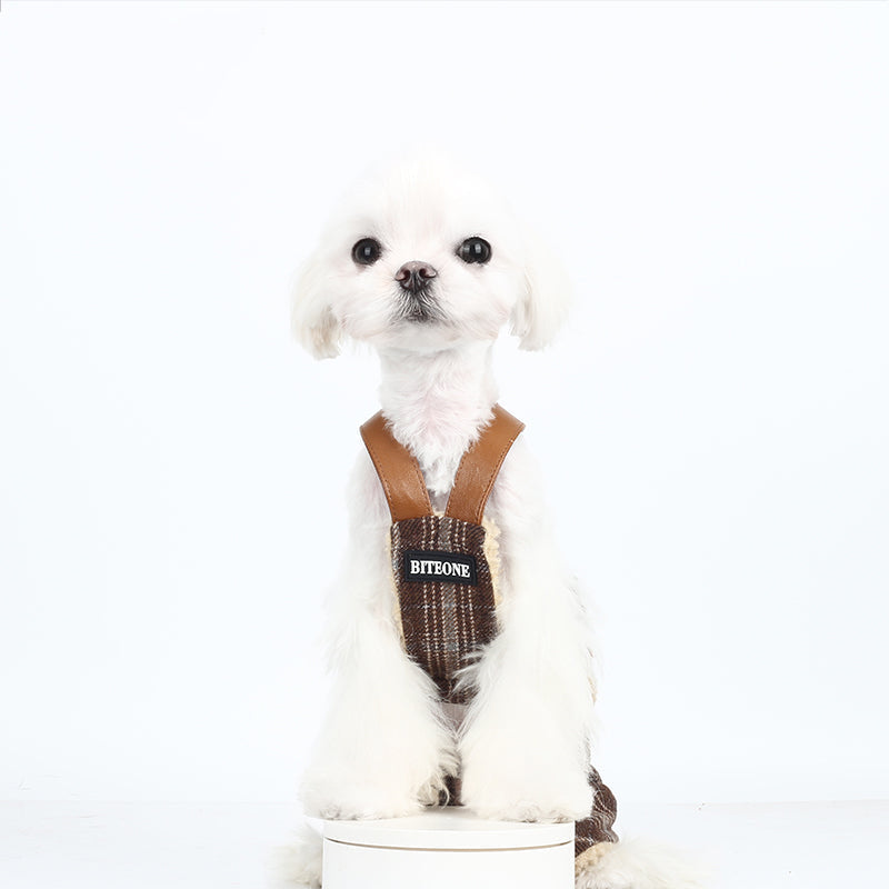 Dress your pup in style with these charming plaid overalls, perfect for colder weather. This outfit features a classic brown plaid pattern paired with a warm knit sweater top and stylish faux leather details. With a cozy sherpa lining and an adjustable harness design, it’s as functional as it is fashionable, ensuring your dog stays comfortable and snug while looking irresistibly cute. Ideal for outdoor walks or indoor lounging, this piece is a must-have for any stylish pet wardrobe.