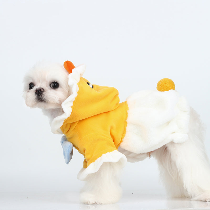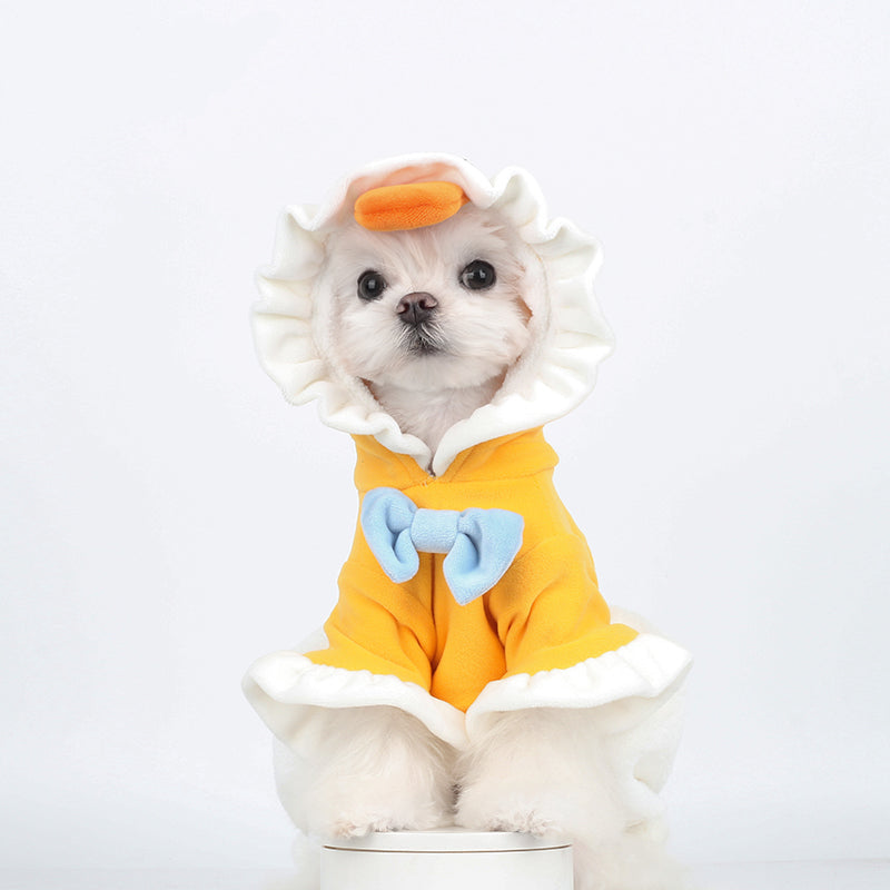 Transform your furry friend into an adorable little duckling with the Ducky Delight Costume! This cozy, bright-yellow outfit features a playful duck beak hood, soft ruffled edges, and a charming blue bow on the chest. Perfect for photoshoots, holidays, or just adding a splash of cuteness to their everyday look. The plush white tail detail adds the final touch to this delightful design. Comfortable and stylish, it’s sure to make your pet the star of the show!