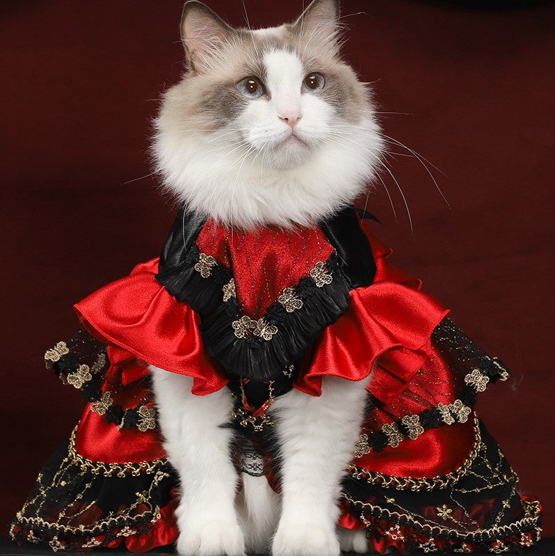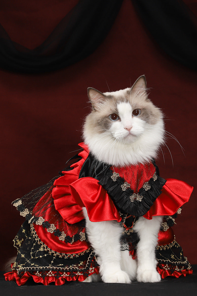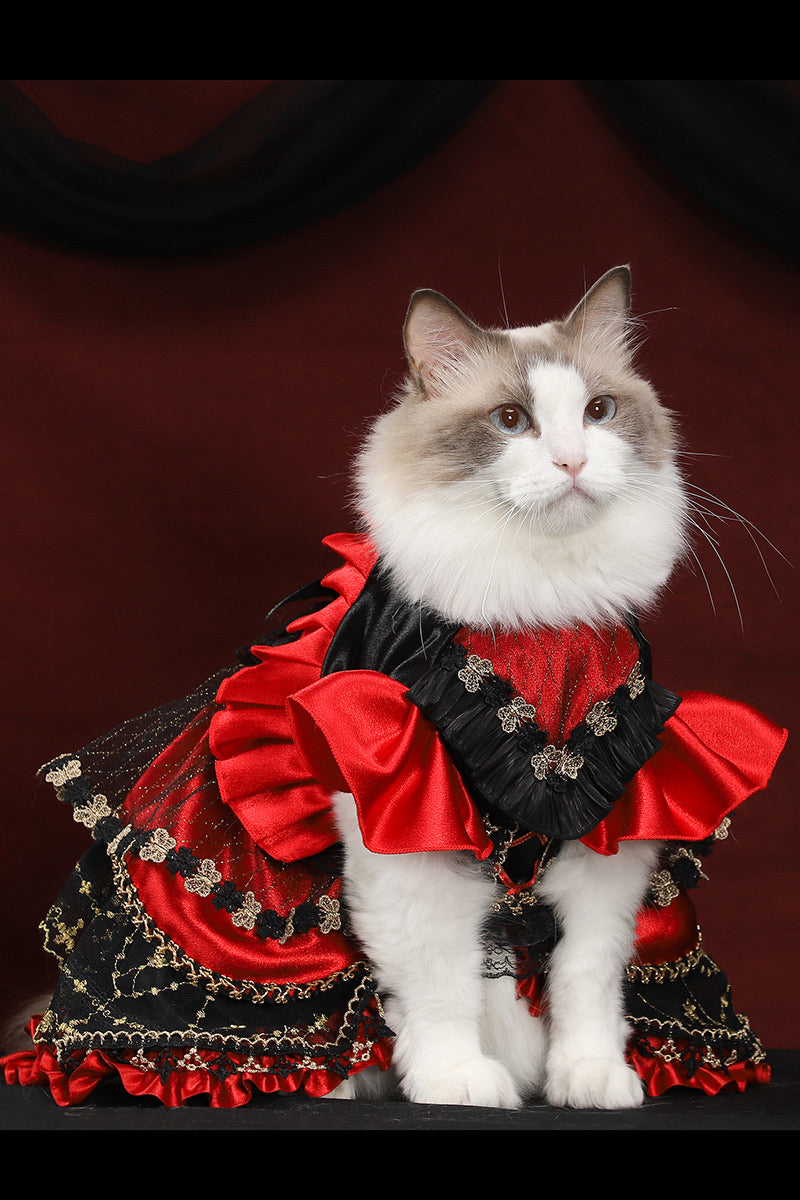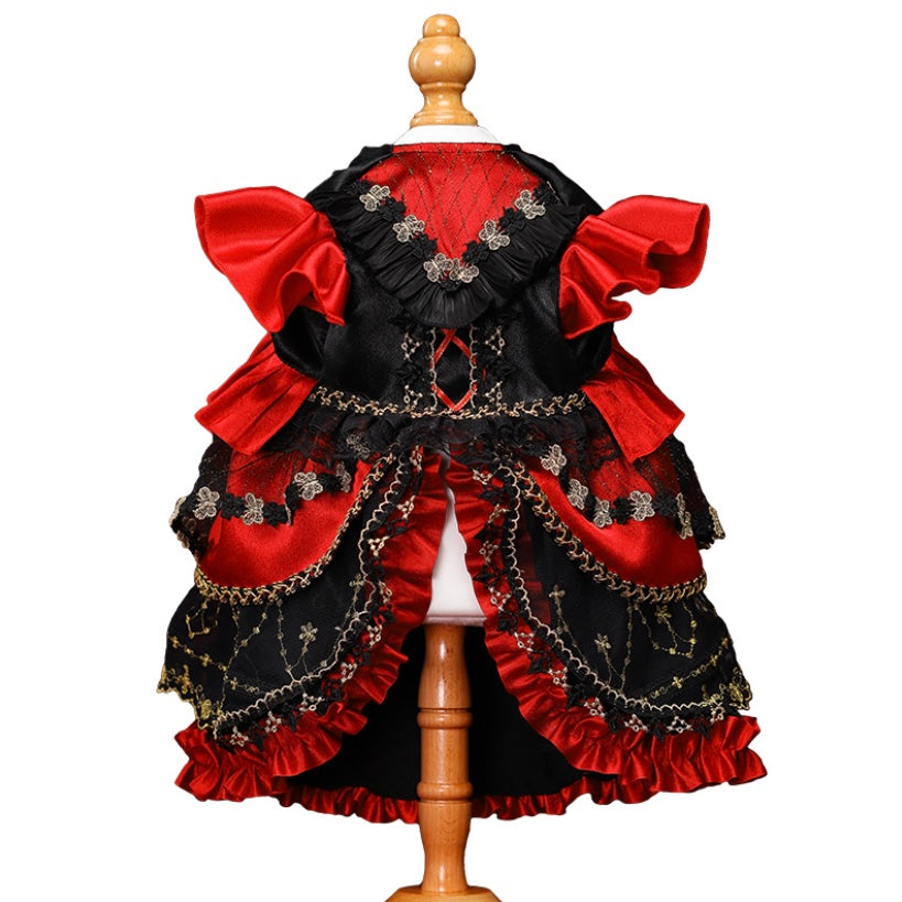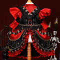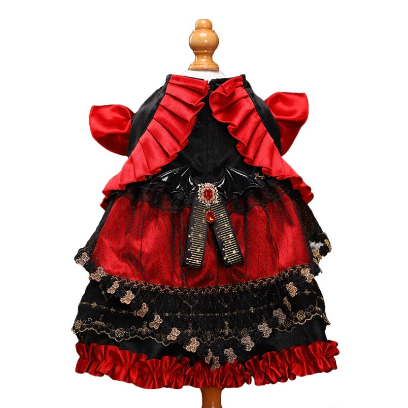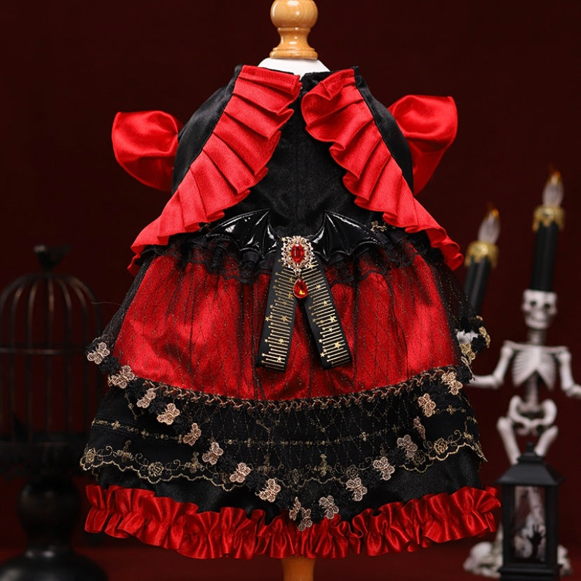 Step into a world of gothic romance with this mesmerizing Halloween costume. This witch-inspired ensemble embodies elegance and mystery, with deep red and black tones adorned with intricate lace and frills. The central red gemstone, set between bat-like wings, radiates an aura of magical power, while the flowing dress exudes a regal yet dark allure. This outfit captures the essence of a cold yet gentle witch, wandering through the night, capable of uncovering the hidden sins lurking in the shadows. It evokes both awe and fascination with its sophisticated and otherworldly presence.