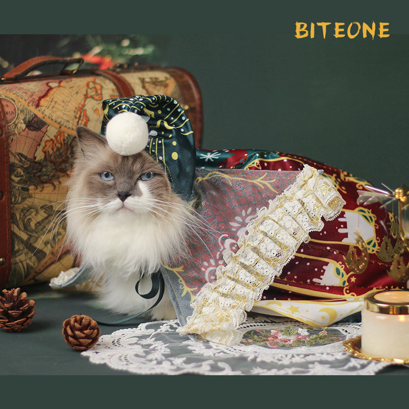 Dress your pet in royal elegance with the Royal Holiday Pet Cloak, designed to make your furry friend the star of any celebration. Featuring festive deep red and green tones, accented with intricate golden patterns and delicate lace trim, this cloak exudes luxury and charm. A playful white pompom on the back completes the look, adding a touch of whimsy. Perfect for photoshoots, holiday gatherings, or special occasions, this cloak ensures your pet stands out with style and grace.