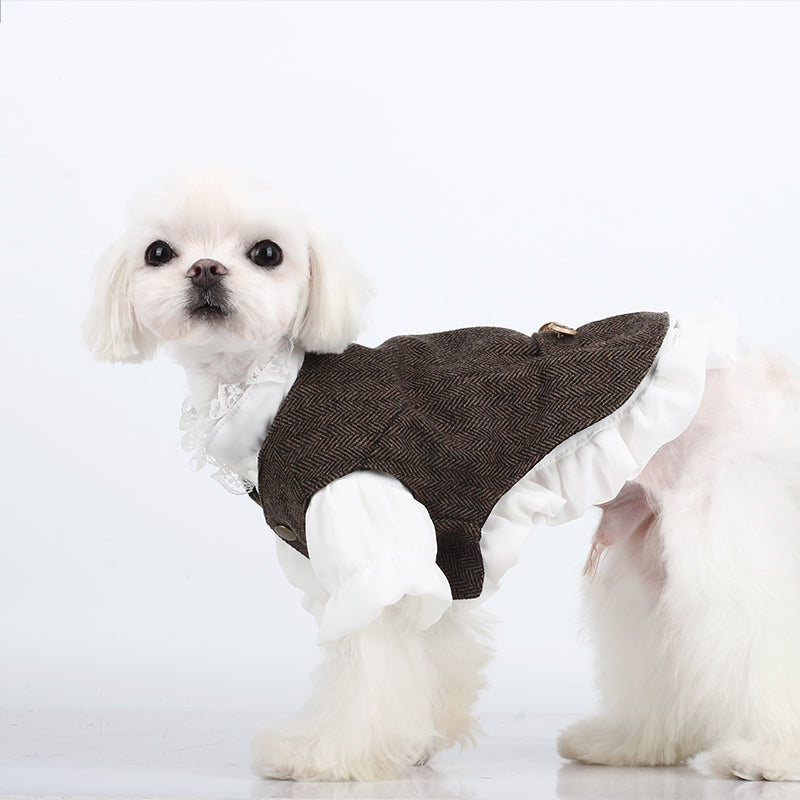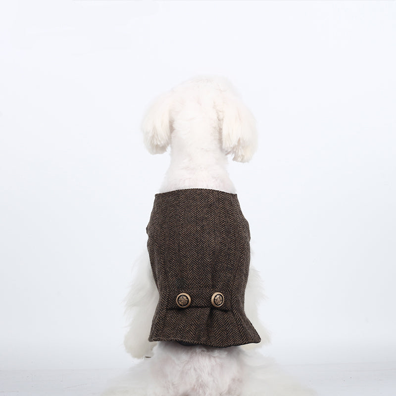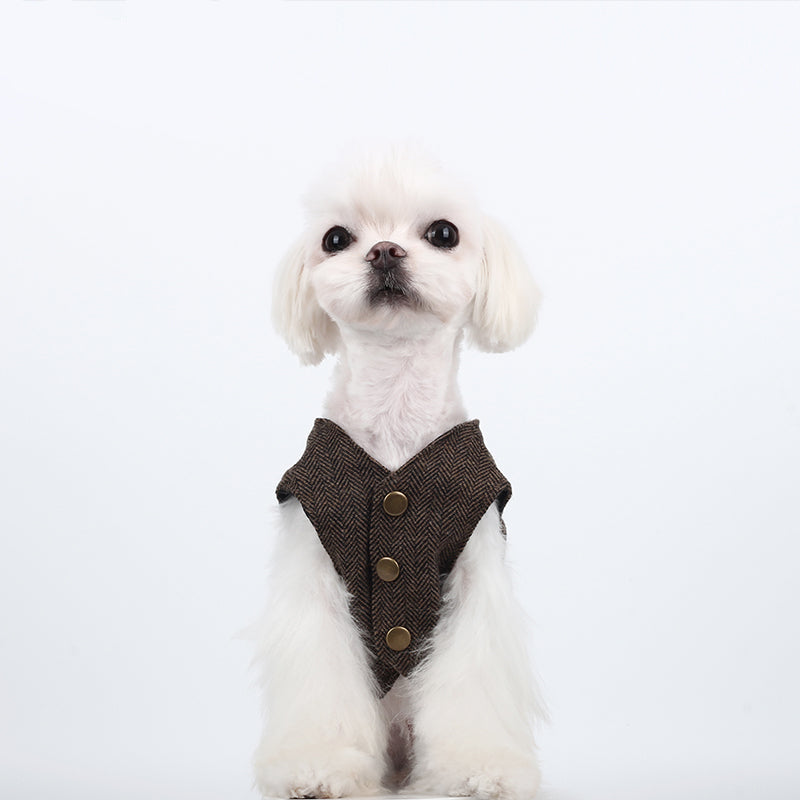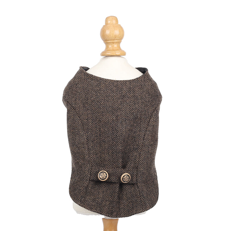 Transform your pet into the epitome of sophistication with Sir Barkington's Classic Herringbone Vest. This timeless piece combines elegance with comfort, crafted in a refined brown herringbone pattern and accented with antique brass buttons. The vest-style design provides a snug yet flexible fit, allowing for ease of movement while maintaining a gentlemanly appearance. Perfect for formal occasions or stylish everyday wear, this vest will make your pet the most dapper companion around.